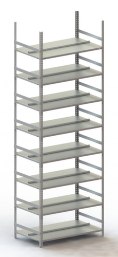les principales dimensions du META rayonnage pour classeurs en un coup d’œil :Vous pourrez organiser au mieux vos dossiers, classeurs et autres outils de bureau sur 8 niveau(x) avec tablettes en tôle d’acier de qualité / 8 hauteurs de classeur. hauteurs de compartiments réglables par pas de 25 mm selon l’usage prévu et vos besoins. niveaux avec rebord antichute arrière contre la chute de classeurs. les canaux longitudinaux en forme de M à 5 pliages garantissent un degré élevé de stabilité et de protection contre les blessures. utilisation bilatéral - possibilité d’installation flexible librement dans la pièce. structure en acier, montants galvanisé avec finition peinture époxy antichocs et antirayures en RAL7035 gris clair, niveaux galvanisé avec finition peinture époxy antichocs et antirayures en RAL7035 gris clair.