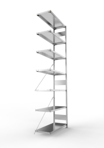 pour votre sécurité : selon DIN EN 15635, il est impératif de sécuriser et de fixer au sol les rayonnages à tablettes dont la hauteur correspond au moins à quatre fois la profondeur du rayonnage (rapport 4:1). les charges max. par tablette indiquées s’entendent pour une répartition uniforme de la charge. des tablettes/niveaux supplémentaires sont disponibles jusqu’à la charge max. par élément.