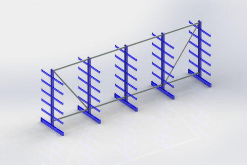 les principales dimensions du META du META rayonnage cantilever Atlas ST Atlas ST en un coup d’œil :utilisation bilatéral - possibilité d’installation flexible librement dans la pièce. 6 niveaux de stockage. 5 niveaux avec bras, avec rebord antichute. force par bras 200 kg. Bras de longueur identique, positionnement droit. profondeur utile 500 mm. structure en acier. montants décapé au jet de sable et finition peinture époxy en RAL5010 bleu gentiane. bras décapé au jet de sable et finition peinture époxy en RAL5010 bleu gentiane.