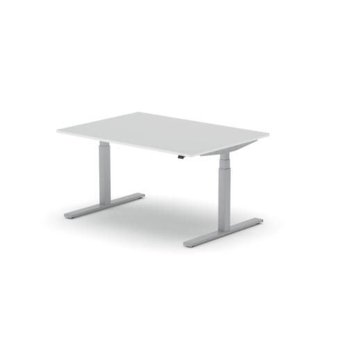 panneau en aggloméré avec revêtement mélaminé, facile d’entretien finition BI White. forme de panneau rectangulaire. piètement en T en RAL9006 aluminium blanc. réglage en hauteur via moteur électrique avec transmission manuelle. avec fiche Euro.