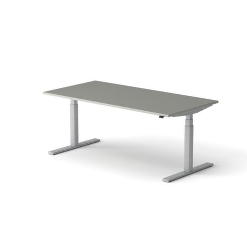 panneau en aggloméré avec revêtement mélaminé, facile d’entretien finition MP Platinum. forme de panneau rectangulaire. piètement en T en RAL9006 aluminium blanc. réglage en hauteur via moteur électrique avec transmission manuelle et affichage. fonctions : Mémorisation et rappel automatique des hauteurs de table programmées grâce à la fonction mémoire. avec fiche Euro.
