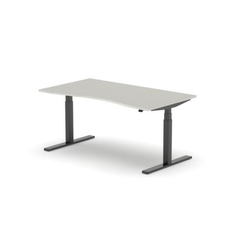 panneau en aggloméré avec revêtement mélaminé, facile d’entretien finition MB White Grey. forme de panneau oscillé. piètement en T en RAL9005 noir foncé. réglage en hauteur via moteur électrique avec transmission manuelle. avec fiche Euro.