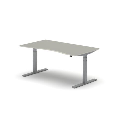 panneau en aggloméré avec revêtement mélaminé, facile d’entretien finition MB White Grey. forme de panneau oscillé. piètement en T en RAL9006 aluminium blanc. réglage en hauteur via moteur électrique avec transmission manuelle et affichage. fonctions : Mémorisation et rappel automatique des hauteurs de table programmées grâce à la fonction mémoire. avec fiche Euro.