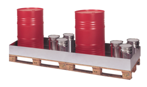 "longDescription": "<h2>Plateau d'appoint pour palettes</h2><ul><li>Pour l'installation sur des europalettes ou des palettes chimiques</li><li>En tôle d'acier de 3 mm d'épaisseur, galvanisée à chaud ou peinte en bleu ciel RAL 5015.</li></ul>",