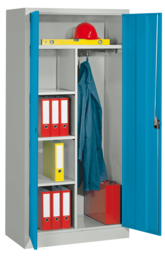 les principales dimensions de l’PAVOY armoire universelle Basis en un coup d’œil :Le corps de l’armoire est fabriqué en tôle d'acier et soudé de manière stable. Cela rend la structure particulièrement robuste et résistante, et donc plus durable. Les coins et les angles soudés du corps garantissent une plus grande étanchéité et donc une meilleure protection contre la poussière, l’humidité et la saleté qu’une structure vissée. En outre, il n’est pas nécessaire de procéder à des travaux d’entretien réguliers ni à des réajustements. La cloison de séparation médiane divise l’armoire en deux zones distinctes qui peuvent être utilisées de différentes manières et pour des objets de tailles différentes. Équipé à gauche de 3 tablettes, à droite de 1 tringle à vêtements avec 3 crochets coulissants. Grande flexibilité de l’aménagement intérieur grâce à la possibilité de régler la hauteur du compartiment par pas de 17 mm. équipé de tablettes, tablette à chapeaux, tringle à vêtements, crochet. La porte à double battant facilite particulièrement l’accès au contenu de l’armoire. Les gonds intérieurs des portes battantes offrent l’avantage d’un visuel net, car aucune vis ou charnière n’est visible de l’extérieur. Le design de l’armoire n’est donc pas altéré et l’ensemble du meuble semble de meilleure qualité. La surface lisse est également plus facile à nettoyer, car aucun dépôt de saleté ou de poussière n’est à craindre aux endroits inaccessibles. Le profilé en caisson intérieur et le pli sur tous les côtés augmentent la rigidité des portes et les rendent plus résistantes aux déformations. Elles peuvent ainsi résister à des charges plus importantes et offrent une haute protection antivol. l’armoire polyvalente s’ouvre avec poignée tournante. verrouillable avec serrure à cylindre. Le socle encastré permet de répartir uniformément le poids de l’armoire sur le sol. Cela augmente la stabilité et l’armoire peut supporter des charges plus lourdes qu’une armoire à pieds. De plus, la saleté, la poussière et l’humidité ne peuvent pas s’infiltrer sous l’armoire, ce qui réduit la surface de nettoyage.