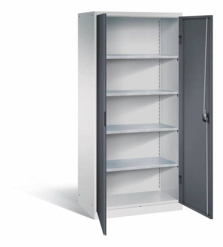 Le corps de l’armoire est fabriqué en acier et soudé de manière stable. Cela rend la structure particulièrement robuste et résistante, et donc plus durable. Les coins et les angles soudés du corps garantissent une plus grande étanchéité et donc une meilleure protection contre la poussière, l’humidité et la saleté qu’une structure vissée. En outre, il n’est pas nécessaire de procéder à des travaux d’entretien réguliers ni à des réajustements. Grande flexibilité de l’aménagement intérieur grâce à la possibilité de régler la hauteur du compartiment par pas de 17 mm. équipé de 4 tablettes. double porte battante. verrouillable avec serrure à cylindre avec verrouillage 2 points. verrouillage commun des portes. Le socle encastré permet de répartir uniformément le poids de l’armoire sur le sol. Cela augmente la stabilité et l’armoire peut supporter des charges plus lourdes qu’une armoire à pieds. De plus, la saleté, la poussière et l’humidité ne peuvent pas s’infiltrer sous l’armoire, ce qui réduit la surface de nettoyage.