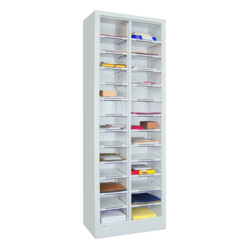26 compartiments offrent un espace de rangement suffisant pour stocker et trier par ex. des papiers, consommables ou pièces de rechange. 2 compartiments par niveau. hauteurs de compartiments réglables par pas de 17 mm selon l’usage prévu et vos besoins. construction en acier avec finition époxy résistante aux chocs et aux rayures. niveaux en comme couleur du corps.