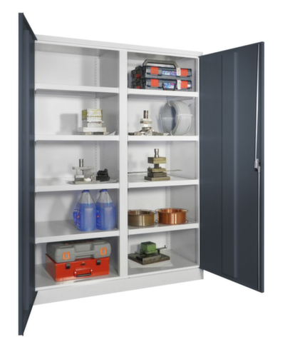 les principales dimensions de l’PAVOY armoire universelle Basis en un coup d’œil :Le corps de l’armoire est fabriqué en acier et soudé de manière stable. Cela rend la structure particulièrement robuste et résistante, et donc plus durable. Les coins et les angles soudés du corps garantissent une plus grande étanchéité et donc une meilleure protection contre la poussière, l’humidité et la saleté qu’une structure vissée. En outre, il n’est pas nécessaire de procéder à des travaux d’entretien réguliers ni à des réajustements. La cloison de séparation médiane divise les niveaux en deux compartiments séparés et permet ainsi d’organiser davantage l’espace de rangement pour différents objets. Équipé à gauche de 4 tablettes, à droite de 4 tablettes. Grande flexibilité de l’aménagement intérieur grâce à la possibilité de régler la hauteur du compartiment par pas de 25 mm. équipé de tablettes. double porte battante. Les portes à fermeture encastrée à fleur du corps n’ont pas de bords saillants contre lesquels quelqu’un pourrait se cogner et ne permettent pas à la poussière se déposer. Les portes sont encore renforcées par le profilé en caisson intérieur. l’armoire en acier s’ouvre avec poignée tournante. verrouillable avec serrure à cylindre. Le verrouillage 3 points offre une grande stabilité et une protection anti-effraction efficace.