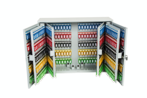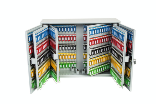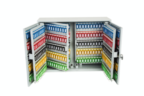 barres à crochets réglables, numérotées et dans plusieurs couleurs. Les anneaux porte-clés et les porte-étiquettes colorés créent ordre et transparence dans l'armoire. Fermeture avec protection contre la poussière via une porte à double battant. verrouillable avec serrure électronique à code programmable avec un code utilisateur personnalisé à 4 chiffres et aisément modifiable selon les besoins. structure en acier. corps avec finition époxy résistante aux chocs et aux rayures en gris. face avant avec finition époxy résistante aux chocs et aux rayures en gris. Préparé pour ancrage de la paroi arrière.