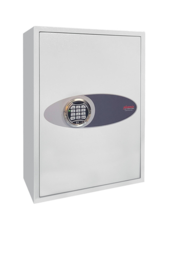 Chiffres et dimensions de l'Phoenix Safe armoire haute sécurité Fortresscorps avec porte battante simple. verrouillable avec serrure électronique haute sécurité. Les plaques antiperçage constituent un dispositif de protection spécial qui empêche le perçage du coffre de sécurité. Les plaques sont insérées de manière à protéger les zones critiques telles que la serrure ou les mécanismes de verrouillage. Elles renforcent la résistance aux attaques mécaniques. S'il y a tentative d'ouverture par la force, le mécanisme de verrouillage d'urgence s'active automatiquement et renforce la sécurité. corps à double paroi. porte à double paroi. structure en acier. corps avec revêtement antirayures en RAL9003 blanc de sécurité. face avant avec revêtement antirayures en RAL9003 blanc de sécurité. couverture d'assurance : jusqu'à 20 000 € pour les particuliers. Préparé pour ancrage de tablette / de panneau arrière.