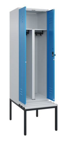 Les principales dimensions de C+P l’armoire vestiaire Classic Plus en un coup d’œil :par compartiment 1 tringle robuste à profil ovale avec 3 doubles crochets coulissants anti-torsion, au-dessus une tablette à chapeaux continue tous les 2 compartiments. Cette tablette extra large offre un espace de rangement idéal pour les EPI comme les casques, les protections oculaires ou auditives. porte à double battant avec fentes d’aération et porte-étiquette. Les gonds intérieurs des portes battantes offrent l’avantage d’un visuel net, car aucune vis ou charnière n’est visible de l’extérieur. Le design de l’armoire n’est donc pas altéré et l’ensemble du meuble semble de meilleure qualité. La surface lisse est également plus facile à nettoyer, car aucun dépôt de saleté ou de poussière n’est à craindre aux endroits inaccessibles. Chaque porte est équipée de série d’un amortisseur, de sorte que, même fermée avec élan, elle ne claque pas. Cela contribue non seulement à améliorer l’environnement sonore, mais protège aussi l’armoire en acier des dommages. La structure BIONIC Steel Frame, inspirée de la nature, est une construction particulièrement efficace et stable. La structure interne raffinée composée de pliages, d’entretoises et d’espaces, ainsi que la plus grande épaisseur de matériau aux endroits cruciaux, comme à l’avant des parois latérales et dans les profilés de cloisons et de caissons, augmentent encore la rigidité. Verrouillable avec Porte-cadenas de sécurité pour cadenas. La serrure de sécurité est particulièrement résistante aux effractions puisqu’elle tourne en position verrouillée et se verrouille uniquement après le retrait de la serrure. Convient pour tous les cadenas avec une épaisseur d'anse de 6 - 8 mm. Chaque personne dispose de 2 compartiments qui peuvent être verrouillés ensemble via des portes convergentes. Cela permet de séparer de manière simple et efficace les vêtements de travail et ceux de tous les jours. Les orifices de ventilation supplémentaires dans le compartiment, combinés aux fentes d’aération dans la porte, améliorent le flux d’air. L’intérieur de l’armoire est ainsi mieux ventilé et son contenu sèche plus vite, sans générer de mauvaises odeurs. Le banc intégré assure une utilisation efficace de l'espace disponible. Il permet de s'habiller et de se déshabiller facilement et offre un espace de rangement supplémentaire sans prendre de place. Les lames sont en plastique. Le piètement intégré réduit l'accumulation possible de la poussière et de la saleté en facilitant le nettoyage de toute la surface. Crée en plus un espace de rangement supplémentaire sous l'armoire. Les chaussures et les sacs ne sont plus dans le passage, et le risque de trébuchement est minimisé. structure en acier, soudé de manière stable. Cela rend la structure particulièrement robuste et résistante, et donc plus durable. Les coins et les angles soudés du corps garantissent une plus grande étanchéité et donc une meilleure protection contre la poussière, l’humidité et la saleté qu’une structure vissée. En outre, il n’est pas nécessaire de procéder à des travaux d’entretien réguliers ni à des réajustements. corps avec thermolaquage en RAL7035 gris clair, face avant avec thermolaquage en RAL 5012 bleu clair.