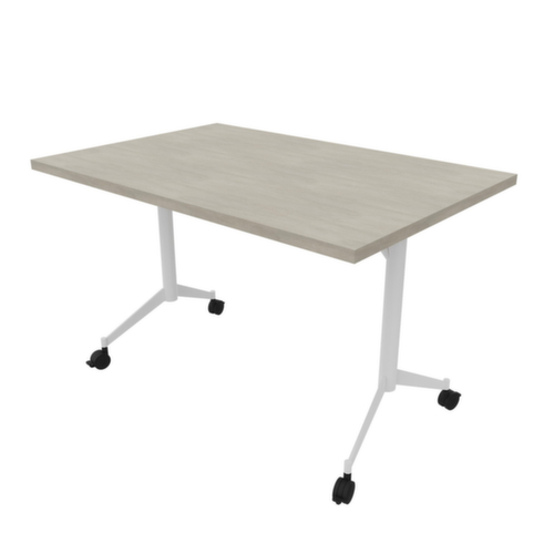 Lorsqu'il n'est pas utilisé, le panneau de table peut être basculé à 90° à l'aide de la poignée-barre et rangé. forme de panneau angulaire. piètement en T en métal avec revêtement poudre époxy en blanc. tube ovale. 4 roulettes sous le châssis assurent la mobilité nécessaire au quotidien. panneau en Panneau dérivé du bois avec revêtement mélaminé résistant à l'abrasion et à l'humidité finition béton. épaisseur de panneau 30 mm. Une bande de chant ABS résistant aux chocs protège tous les bords de fissures et d'éclatements inesthétiques. équipé de système à crochets et de verrouillage pour la liaison frontale et latérale de panneaux de table.