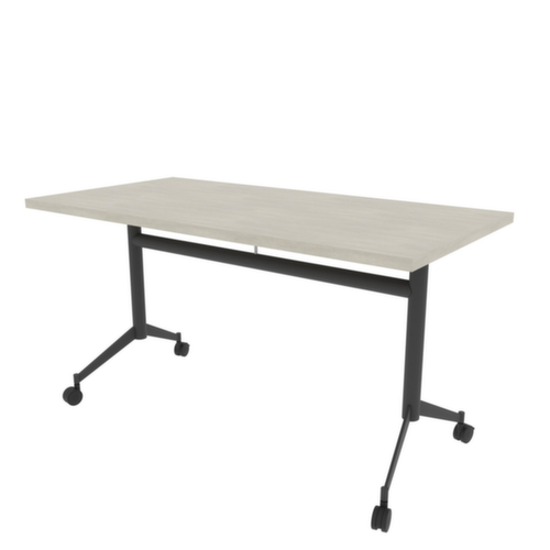 Lorsqu'il n'est pas utilisé, le panneau de table peut être basculé à 90° à l'aide de la poignée-barre et rangé. forme de panneau angulaire. piètement en T en métal avec revêtement poudre époxy en gris foncé. tube ovale. 4 roulettes sous le châssis assurent la mobilité nécessaire au quotidien. panneau en Panneau dérivé du bois avec revêtement mélaminé résistant à l'abrasion et à l'humidité finition béton. épaisseur de panneau 30 mm. Une bande de chant ABS résistant aux chocs protège tous les bords de fissures et d'éclatements inesthétiques. équipé de système à crochets et de verrouillage pour la liaison frontale et latérale de panneaux de table.