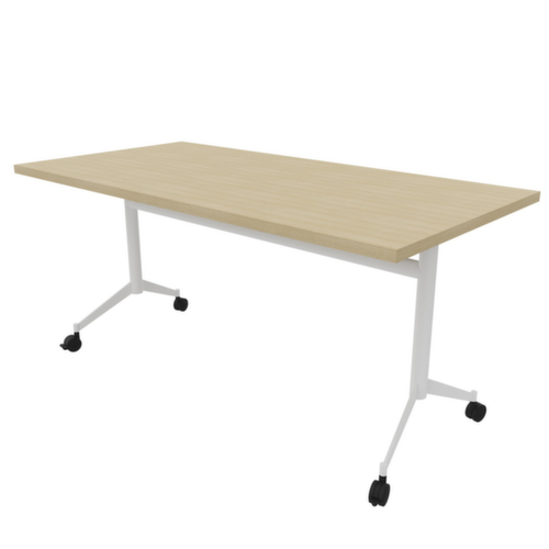 Lorsqu'il n'est pas utilisé, le panneau de table peut être basculé à 90° à l'aide de la poignée-barre et rangé. forme de panneau angulaire. piètement en T en métal avec revêtement poudre époxy en blanc. tube ovale. 4 roulettes sous le châssis assurent la mobilité nécessaire au quotidien. panneau en Panneau dérivé du bois avec revêtement mélaminé résistant à l'abrasion et à l'humidité finition chêne. épaisseur de panneau 30 mm. Une bande de chant ABS résistant aux chocs protège tous les bords de fissures et d'éclatements inesthétiques. équipé de système à crochets et de verrouillage pour la liaison frontale et latérale de panneaux de table.