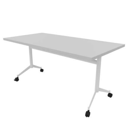 Lorsqu'il n'est pas utilisé, le panneau de table peut être basculé à 90° à l'aide de la poignée-barre et rangé. forme de panneau angulaire. piètement en T en métal avec revêtement poudre époxy en blanc. tube ovale. 4 roulettes sous le châssis assurent la mobilité nécessaire au quotidien. panneau en Panneau dérivé du bois avec revêtement mélaminé résistant à l'abrasion et à l'humidité finition gris. épaisseur de panneau 30 mm. Une bande de chant ABS résistant aux chocs protège tous les bords de fissures et d'éclatements inesthétiques. équipé de système à crochets et de verrouillage pour la liaison frontale et latérale de panneaux de table.