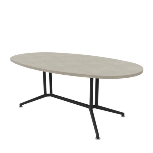 forme ovale. châssis en acier avec revêtement poudre époxy en gris foncé. tube carré et tube rond. châssis avec patins en plastique de mise à niveau, parfaits pour compenser les inégalités du sol. panneau en Panneau dérivé du bois avec revêtement mélaminé résistant à l'abrasion et à l'humidité finition béton. épaisseur de panneau 30 mm. bord avec bande de chant ABS résistante aux chocs qui offre une protection contre les fissures et les éclatements disgracieux. bord du panneau béton. traverses avec revêtement poudre époxy.