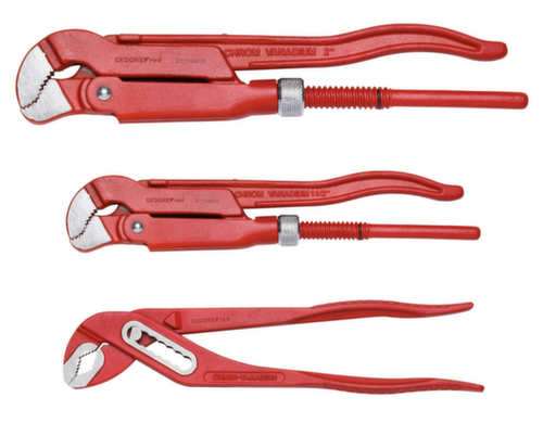 "longDescription": "Pince à tuyaux 1.1/2\" et 2\", mâchoire en S : Exécution selon DIN 5234, Exécution massive, Position de la mâchoire coudée à 45°, Denture décalée par rapport au sens de rotation, Mâchoires polies, Ecrou de réglage imperdable, Acier au chrome-vanadium, Pince à pompe à eau 10\", réglable en 7 positions : Exécution selon DIN 8976 Forme C, Surfaces de préhension à denture longitudinale, Avec métier traversant, réglable en 7 positions, Tête et métier polis, Acier au chrome-vanadium, Revêtement rouge par poudre<br>",