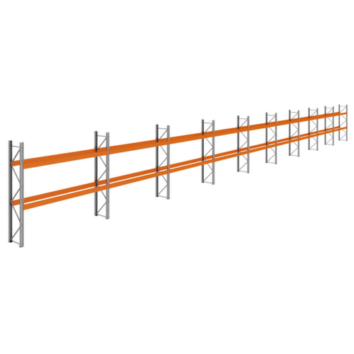 Les principales dimensions du rayonnage à palettes en un coup d'œil :9 éléments standard avec chacun 2 niveau(x) avec traverses offrent une capacité de stockage pour 54 palettes au total. hauteurs de compartiments réglables par pas de 70 mm selon l’usage prévu et vos besoins. Chaque élément standard offre 6 emplacements pour palettes (stockage du sol incl.). entreposage transversal. Les traverses longitudinales sont accrochées à l'échelle à l'aide de mâchoires à trois crochets et d'une sécurité antidécrochage. utilisation unilatéral - conçu pour un montage mural. grande stabilité grâce aux supports de tablette avec profilés en caisson fermés. structure en acier. montants avec revêtement en zinc anti-corrosion. niveaux en RAL2004 orangé pur.