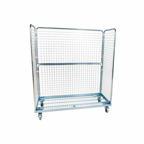 rehausses : 3 parois (grillagées). structure en acier galvanisé en bleu. plateforme en treillis. Manœuvre et déplacement aisés grâce à 4 roulettes pivotantes. Ø de roue 125 mm. Avec bandage élastique préservant le sol sur jante polyamide. Les freins des 2 roulettes pivotantes assurent une bonne stabilité.