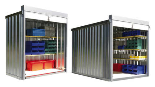 "description": "HxlxP 2320x2100x1140mm, a. sol bois, porte à rideau en alu, galvanisé",
