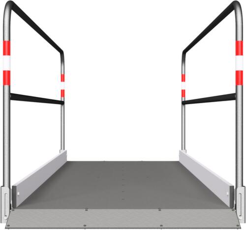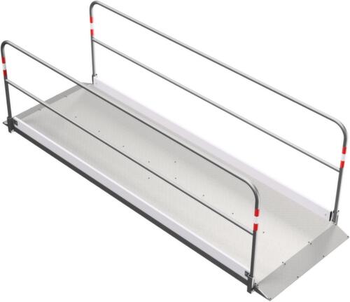 Les principales dimensions en un coup d'œil :structure en acier avec revêtement en zinc anti-corrosion. plateforme en aluminium avec tôle larmée antidérapante. équipé de avec rampe d'accès et rambardes latérales réfléchissantes. Les deux rambardes peuvent être déplacées pour un transport et un stockage peu encombrants.