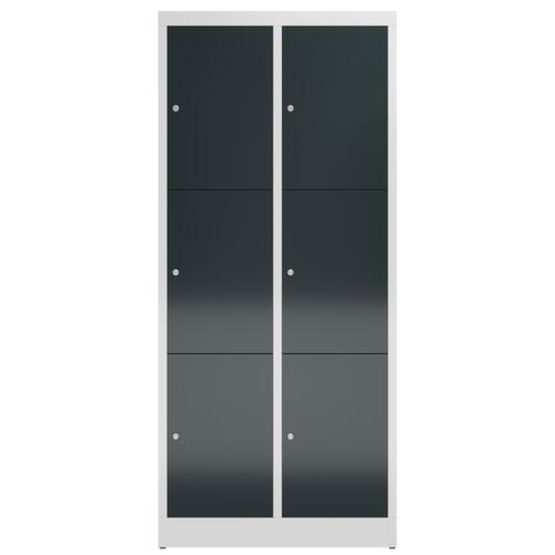 porte à battants. verrouillable avec serrure à cylindre. structure en acier, soudé. corps avec finition peinture époxy électrostatique en RAL7035 gris clair. face avant avec finition peinture époxy électrostatique en RAL7016 gris anthracite.