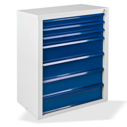 structure en acier. équipement des tiroirs : dimensions utiles tiroirs largeur x profondeur 570 x 338 mm, hauteur utile = hauteur frontale - 15 mm. force par tiroir 40 kg. L'extension totale garantit à 100 % un accès facile jusque dans le moindre recoin. L'extension sur roulement à billes facilite l'ouverture et la fermeture du tiroir. avec Blocage d’extension. Le blocage permet d’éviter une extraction complète accidentelle de tous les tiroirs. verrouillable avec verrouillage centralisé. corps avec finition époxy résistante aux chocs et aux rayures en RAL7035 gris clair. face avant avec finition époxy résistante aux chocs et aux rayures en RAL 5012 bleu clair.