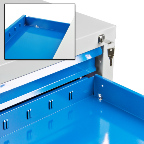 structure en acier. équipement des tiroirs : dimensions utiles tiroirs largeur x profondeur 570 x 338 mm, hauteur utile = hauteur frontale - 15 mm. force par tiroir 40 kg. L'extension totale garantit à 100 % un accès facile jusque dans le moindre recoin. L'extension sur roulement à billes facilite l'ouverture et la fermeture du tiroir. avec Blocage d’extension. Le blocage permet d’éviter une extraction complète accidentelle de tous les tiroirs. verrouillable avec verrouillage centralisé. corps avec finition époxy résistante aux chocs et aux rayures en RAL7035 gris clair. face avant avec finition époxy résistante aux chocs et aux rayures en RAL 5012 bleu clair.