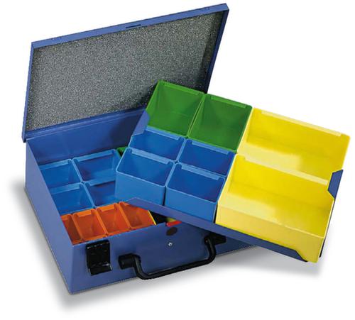 Verrouillable par serrure de sécurité. bacs amovible et inscriptible. avec Poignée de transport. mallette en acier / bacs en polystyrène résistant aux chocs. mallette avec finition époxy résistante aux chocs et aux rayures en RAL5007 bleu brillant. bacs en de couleur. Verrouillable avec couvercle, avec coussinet de compression en mousse.