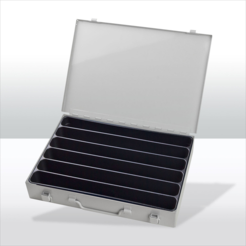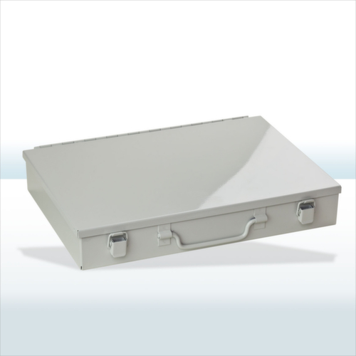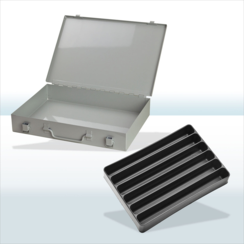 Verrouillable par 2 fermetures à grenouillère. équipé de compartimentage amovible avec casiers de même longueur. avec Poignée de transport. mallette en tôle d'acier / bacs en plastique. mallette avec finition époxy résistante aux chocs et aux rayures en RAL7035 gris clair. bacs en noir.