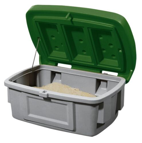 en polyéthylène résistant aux chocs. équipé de couvercle rabattable qui se démonte rapidement et facilement - sans le moindre outil. Verrouillable : grâce au dispositif de suspension, il est possible d’installer facultativement et aisément un cadenas sur le couvercle et sur le corps. Une protection contre un accès non autorisé est ainsi possible à tout moment. récipient gris, couvercle vert. parois plein - comme exécution sans ouverture pour retrait. Ceci contribue à accroître la robustesse du collecteur. fond plein. Gerbages avec couvercle ouvert.