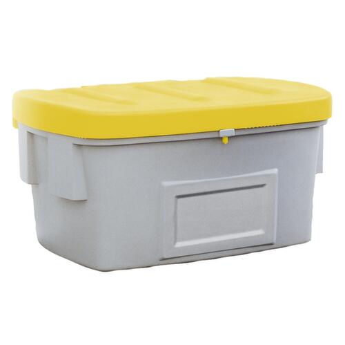 en polyéthylène résistant aux chocs. équipé de couvercle rabattable qui se démonte rapidement et facilement - sans le moindre outil. Verrouillable : grâce au dispositif de suspension, il est possible d’installer facultativement et aisément un cadenas sur le couvercle et sur le corps. Une protection contre un accès non autorisé est ainsi possible à tout moment. récipient gris, couvercle jaune. parois plein - comme exécution sans ouverture pour retrait. Ceci contribue à accroître la robustesse du collecteur. fond plein. Gerbages avec couvercle ouvert.