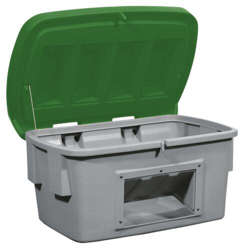 en polyéthylène résistant aux chocs. équipé de couvercle rabattable qui se démonte rapidement et facilement - sans le moindre outil. Verrouillable : grâce au dispositif de suspension, il est possible d’installer facultativement et aisément un cadenas sur le couvercle et sur le corps. Une protection contre un accès non autorisé est ainsi possible à tout moment. récipient gris, couvercle vert. parois plein avec ouverture pour retrait pratique. Il est ainsi possible de prélever le matériel en toute aisance sans avoir à ouvrir le couvercle. fond plein. Gerbages avec couvercle ouvert.