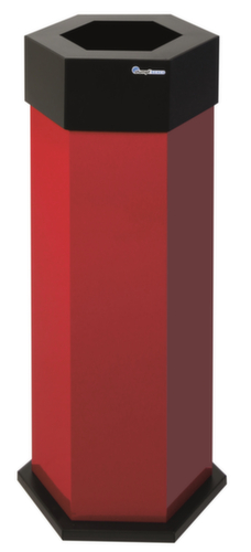 seau intérieur avec revêtement en zinc anti-corrosion. Vidage facile par récipient intérieur amovible. La partie supérieure rabattable est maintenue ouverte par les vérins à gaz. Les mains restent ainsi libres pour sortir rapidement les ordures. verrouillable avec serrure à clé carrée. corps en Tôle d'acier de qualité galvanisé avec finition peinture époxy antichocs et antirayures RAL3003 rouge rubis. partie supérieure en acier galvanisé avec finition peinture époxy antichocs et antirayures RAL9005 noir foncé. soubassement face avant avec 2 roulettes facilitant le déplacement p. ex. pour les travaux de nettoyage.