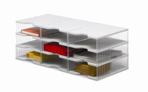 "longDescription": "<h2>Système d'archivage</h2><ul><li>Station de tri avec des compartiments extra larges pour, par exemple, les journaux, les dossiers de signatures, les grandes enveloppes, les magazines et les tubes en carton.</li><li>Dimensions du compartiment interne HxLxP 90x280x380 mm</li><li>Matériel d'étiquetage inclus</li><li>Fabriqué en polystyrène résistant aux chocs</li><li>Panneaux latéraux et arrière transparents pour une vue d'ensemble rapide</li><li>Le système peut être étendu en hauteur et en largeur à tout moment.</li><li>Support antidérapant grâce aux pieds en caoutchouc</li></ul>",
