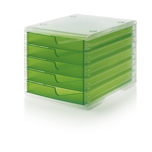 "metaDescription": "Styro Module à tiroirs styroswingbox light, pour DIN C4 - 5xDIN C4, posit. sur table, HxlxP 255x270x340mm, Polystyrène, transparent/kiwi",