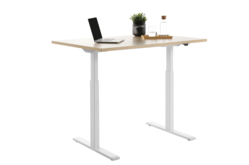 panneau en aggloméré avec revêtement mélaminé, facile d’entretien finition érable. forme de panneau rectangulaire. piètement en T en blanc. réglage en hauteur via 2 moteurs électriques facilitent le réglage en hauteur par simple pression d'un bouton. fonctions : Mémorisation et rappel automatique des hauteurs de table programmées grâce à la fonction mémoire. La protection anti-collision automatique s'arrête immédiatement en cas de résistance du haut ou du bas et garantit ainsi une protection absolue.