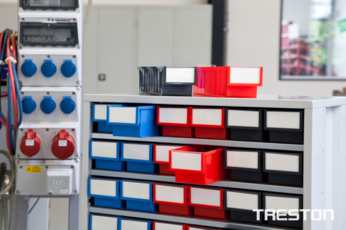 boîtier en acier avec finition époxy résistante aux chocs et aux rayures en RAL7035 gris clair / tiroir en polypropylène incassable. tiroirs en rouge. fond de tiroir ondulé pour une préhension aisée de petits articles. avec Pieds de réglage de hauteur pour une adaptation facile aux irrégularités du sol.