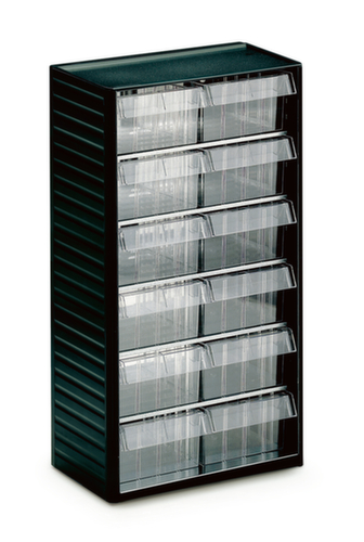 boîtier en polypropylène incassable / tiroirs en polystyrène résistant aux chocs. tiroirs en transparent. fond de tiroir ondulé pour une préhension aisée de petits articles. tablettes en acier, avec revêtement en zinc anti-corrosion.
