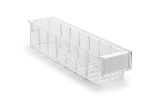 "longDescription": "<h2>Bac transparent pour petites pièces</h2><strong>avec grandes poignées encastrées pour soulever facilement</strong><br><ul><li><strong>Structure claire</strong> - avec très grande étiquette et vitre de protection</li><li><strong>Vue d'ensemble rapide</strong> - bac en polystyrène transparent</li><li><strong>Soulever en toute sécurité</strong> - poignées encastrées ergonomiques sur le côté et la face arrière</li><li>Empilable avec précision grâce à son bord d'empilage périphérique.</li><li>Peut être rallongé à tout moment - guide rainuré pour accueillir les fraises transversales</li><li><strong>Polyvalence</strong> - insensible à la plupart des huiles, des acides et des alcalis et résiste aux températures comprises entre -40° C et +55° C</li></ul><br>Les bacs de rangement à front ouvert de Treston sont idéaux pour le rangement de vos petites pièces. Grâce à la transparence du matériau, vous pouvez toujours voir ce qui se trouve dans les bacs. Vous pouvez également les étiqueter avec les grandes étiquettes afin que votre rangement de petites pièces soit individuel et parfaitement organisé. Cela permet de gagner du temps car chacun peut trouver rapidement les pièces dont il a besoin. Grâce à la poignée encastrée, vous pouvez rapidement et facilement tirer ou soulever les bacs pour petites pièces.<br><br>Le polystyrène est absolument stable et possède de très bonnes propriétés isolantes. Il est chimiquement résistant aux solvants et aux liquides à base d'eau. Cela fait de cette boîte de rangement ouverte un endroit durable, sûr et pratique pour stocker vos petites pièces.<br><br><strong>Bon à savoir !</strong><br>Des séparateurs transversaux pratiques pour le compartimentage des bacs sont disponibles en accessoires.<br>",