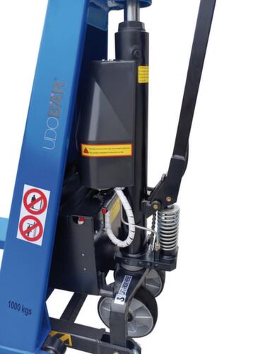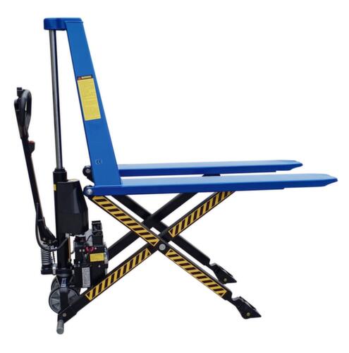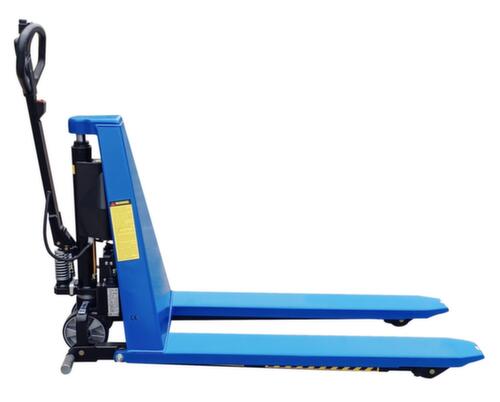commande de levage électrique. roulettes pivotantes avec bandage polyuréthane, largeur x Ø 50 x 180 mm. galets de fourche avec bandage polyuréthane, largeur x Ø 75 x 75 mm. Supports latéraux assurant une bonne stabilité. fourches en acier avec finition époxy résistante aux chocs et aux rayures en RAL5017 bleu signalisation. structure acierrigide. timon en acier/plastique avec finition époxy résistante aux chocs et aux rayures en noir. moteur de levage 0,8 kW.