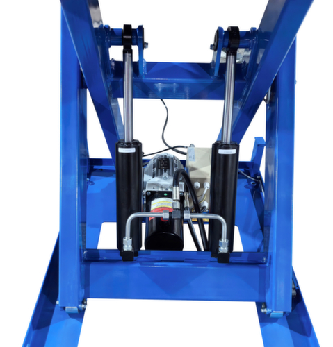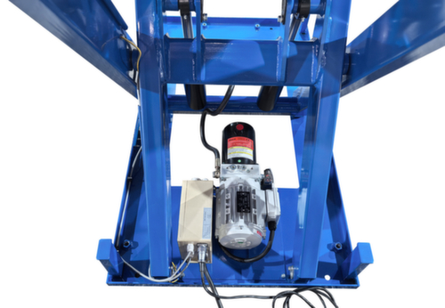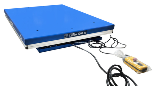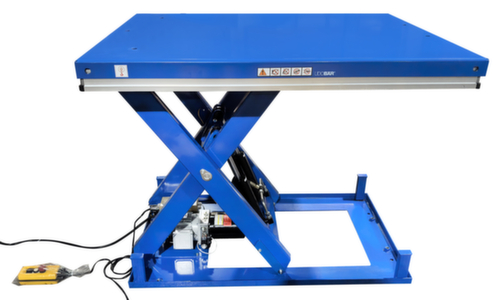 en acier avec finition époxy résistante aux chocs et aux rayures coloris RAL5017 bleu signalisation. exécution de la levée électrique avec bouton-poussoir de levage et de descente. cisaille simple en acier avec finition époxy résistante aux chocs et aux rayures en RAL5017 bleu signalisation. structure acierrigide. plateforme avec trous de fixation dans la surface de base. Si nécessaire, les anneaux de levage fournis peuvent y être vissés afin de pouvoir transporter la table élévatrice en toute sécurité avec un harnais. câble longueur 3,5 m. Avec 400 V/50 Hz. indice de protection IP54 : la poussière se dépose à l'intérieur, projections d'eau dans toutes les directions. classe d'isolation F.