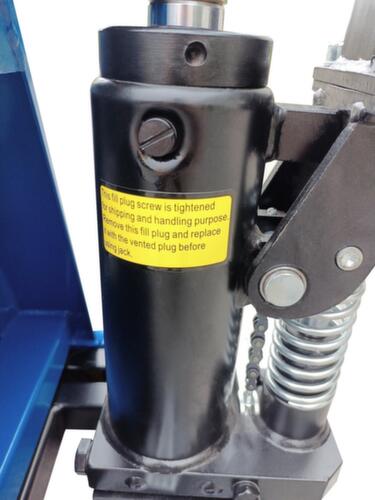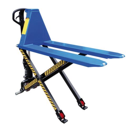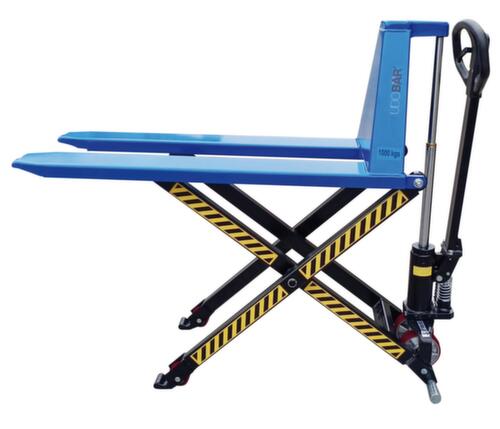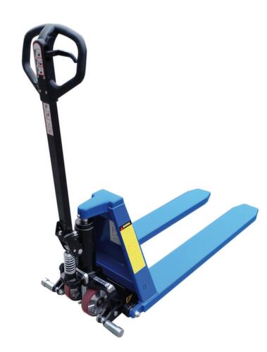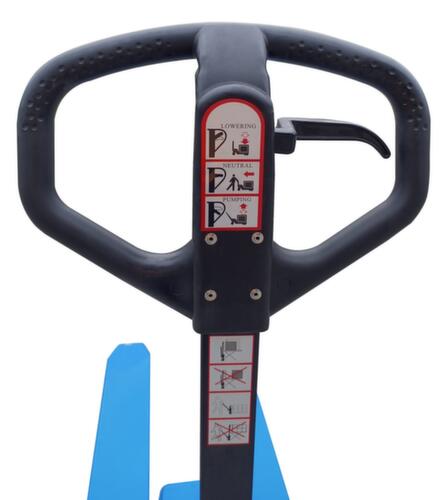 roulettes pivotantes avec bandage polyuréthane, largeur x Ø 50 x 150 mm. galets de fourche avec bandage polyuréthane, largeur x Ø 50 x 75 mm. fourches en acier avec finition époxy résistante aux chocs et aux rayures en RAL5017 bleu signalisation. structure acierrigide. timon en acier/plastique avec finition époxy résistante aux chocs et aux rayures en noir. levée hydraulique avec la pompe à main. pistons chromé.