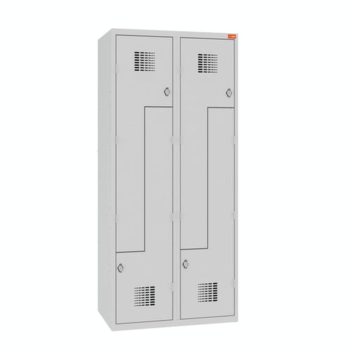 par compartiment 1 tringle avec 2 doubles crochets et 1 tablette amovible par compartiment. porte battante en Z avec porte-étiquette et fentes d’aération. verrouillable avec serrure porte-cadenas. Les perforations WEMO standardisées assurent une circulation optimale de l'air à l'intérieur de l'armoire. structure en tôle d'acier. corps avec revêtement de zirconium non corrosif en RAL7035 gris clair, face avant avec revêtement de zirconium non corrosif en RAL7035 gris clair.