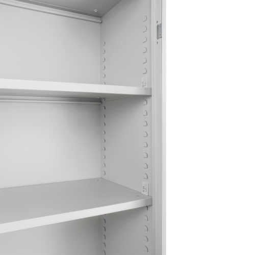 les principales dimensions de l’ armoire universelle en un coup d’œil :Fabriqué en acier. Grande flexibilité de l’aménagement intérieur grâce à la possibilité de régler la hauteur du compartiment par pas de 25 mm. équipé de tablettes. La porte à double battant facilite particulièrement l’accès au contenu de l’armoire. Les portes à fermeture encastrée à fleur du corps n’ont pas de bords saillants contre lesquels quelqu’un pourrait se cogner et ne permettent pas à la poussière se déposer. Chaque porte est équipée en série d'amortisseurs en caoutchouc insonorisants qui empêchent la porte de claquer même lorsqu'elle est fermée énergiquement. Cela favorise un environnement sonore agréable tout en protégeant l'armoire contre les dommages. verrouillable avec fermeture barre de poussée avec serrure à cylindre. Le verrouillage de sécurité à 2 points offre une grande stabilité et une protection anti-effraction efficace.