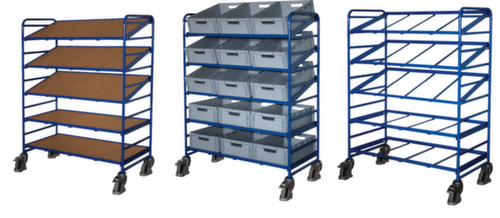 "description": "force 250kg, 5plateau(x), plateforme en acier, av. cadre cornières, inclinable, a. 15bacs, norme Europe, RAL5010, bandage TPE",
