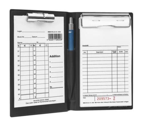 "metaDescription": "pochette pour livre de caisse - p. DIN A6, Hxl 185x120mm, a. pince mémos, porte-crayons, pochette, noir",