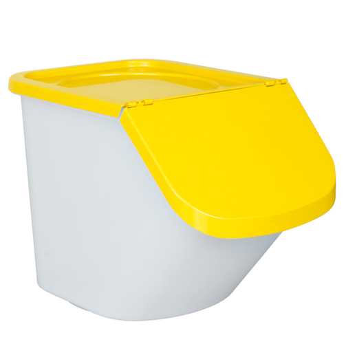 en polypropylène incassable. récipient en blanc et couvercle en jaune. parois : surfaces lisses sans soudures pour un nettoyage facile. équipé de avec une pelle qui peut être accrochée dans le récipient conformément aux directives HACCP. convient pour pour produits en vrac de toute nature. verrouillable avec couvercle rabattable. Le couvercle peut également être ouvert lorsque plusieurs bacs sont empilés. Le contenu du distributeur peut être facilement prélevé grâce à l’ouverture de prise inclinée. convient pour aliments.