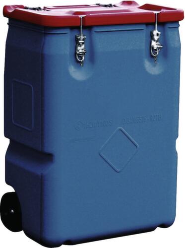 "description": "p. chiffons, liants/granulés, HDPE, bleu, 250l, HxlxP 890x600x600mm, de Fermeture mécanique, a. barre de poussée, 2 roues en plastique rigide",