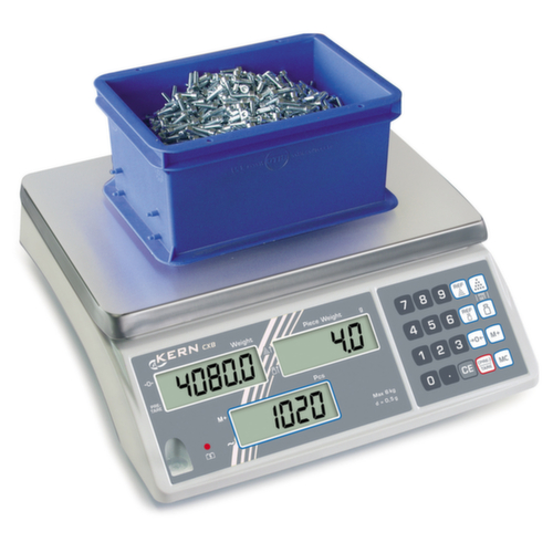 La balance compteuse de la maison KERN est un véritable multitalent. Elle est particulièrement adaptée au comptage et au pesage de petits objets. Mais la balance vous permet également de contrôler des quantités et des poids et d'effectuer des calculs. Utilisez la balance de comptage, par exemple, pour compter les petites pièces lors de votre prochain inventaire!La balance dispose de trois grands écrans sur lesquels sont affichés le poids, le poids de référence et le poids total. Le bloc de touches programmable de la balance vous permet par exemple d'effectuer des préréglages pour un poids de référence ou un nombre de pièces de référence. L'optimisation de référence automatique intégrée permet d'optimiser progressivement la valeur moyenne du poids des pièces. Le bloc de touches vous permet également de programmer des valeurs cibles dont l'atteinte vous est signalée par un signal acoustique. La mémoire de comptage intégrée permet d'additionner le nombre de pièces et le poids. La fonction PRE-TARE permet en outre de déduire manuellement le poids des récipients avant la pesée.La balance compteuse fonctionne sur batterie et est économique - le rétro-éclairage des écrans LED s'éteint automatiquement après 5 secondes.4 modèles disponibles : - Capacité de charge 3 kg : division 0,2 g- Capacité de charge 6 kg : division 0,5 g- Capacité de charge 15 kg : division 1 g- Capacité de charge 30 kg, division 2 gAutres détails : - Dimensions de la balance : L 300 x P 330 x H 110 mm- Poids : env. 4 kg- Dimensions plateau de pesée : 300 L x 225 P mm- Matériau plateau de pesée : acier inoxydable- 3 grands écrans LCD éclairés (hauteur des chiffres 18 mm)- Durée de fonctionnement avec accu : jusqu'à 200 h (sans rétroéclairage)- Accumulateur : temps de charge env. 8 h- Raccordement : Bloc d'alimentation 230 V (intégré dans la balance)- Plage de température ambiante admissible : -10 °C à +40 °C- Unité d'emballage (UE) : 1 pièce- Garantie : 2 ans
